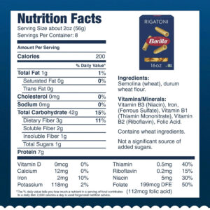Barilla là một công ty gia đình của Ý sản xuất mì ống từ năm 1877. Barilla mang đến cho bạn những loại mì ống ngon nhất được làm bằng sự cẩn thận và các nguyên liệu chất lượng cao nhất; Barilla nỗ lực mang đến cho bạn những loại mì ống ngon nhất, chín đều và hoàn hảo mỗi lần nấu. Mì Barilla Rigatoni của chúng tôi được làm từ lúa mì durum hảo hạng nhất, được chứng nhận không biến đổi gen (non-GMO) và đạt chứng nhận Kosher. Hoàn hảo để kết hợp với nước sốt mì ống yêu thích của bạn.