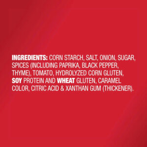 Thành phần : Tinh bột ngô, muối, hành tây, đường, gia vị (bao gồm ớt bột, tiêu đen, cỏ xạ hương), cà chua, gluten ngô thủy phân, protein đậu nành và gluten lúa mì, màu caramel, axit citric và gôm xanthan (chất làm đặc).