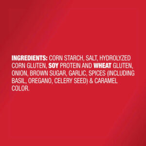 Thành phần : Tinh bột ngô, muối, gluten ngô thủy phân, protein đậu nành và gluten lúa mì, hành tây, đường nâu, tỏi, gia vị (bao gồm húng quế, kinh giới, hạt cần tây) và màu caramel.