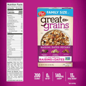 Chế độ ăn ít chất béo bão hòa và cholesterol, và càng ít chất béo chuyển hóa càng tốt, có thể làm giảm nguy cơ mắc bệnh tim. Chứa 4g tổng chất béo mỗi phần. Một hộp ngũ cốc ăn sáng Post Great Grains Nho Khô, Chà Là và Hồ Đào 19 oz (khoảng 480g)